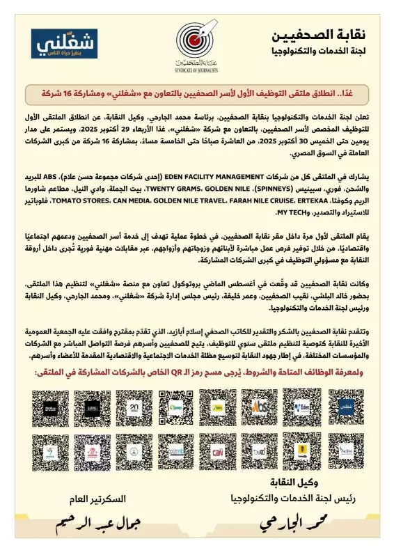 تعلن لجنة الخدمات والتكنولوجيا بنقابة الصحفيين، برئاسة محمد الجارحي، وكيل النقابة، عن انطلاق الملتقى الأول للتوظيف المخصص لأسر الصحفيين، بالتعاون مع شركة «شغلني»، غدًا الأربعاء 29 أكتوبر 2025، ويستمر على مدار يومين حتى الخميس 30 أكتوبر 2025، من العاشرة صباحًا حتى الخامسة مساءً، بمشاركة 16 شركة من كبرى الشركات العاملة في السوق المصري.