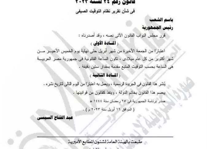 نشرت الجريدة الرسمية في عددها رقم (15 مكرر) الصادر بتاريخ 16 أبريل 2023، قانون رقم 24 لسنة 2023 بشأن تقرير نظام التوقيت الصيفي، بعد أن أقره مجلس النواب وصدق عليه رئيس الجمهورية عبد الفتاح السيسي.