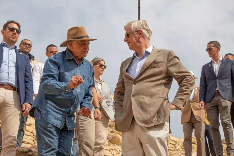 رافَق الدكتور حواسُ الملكَ فيليب خلال جولته الميدانية داخل موقع الحفائر، مقدّمًا شرحًا وافيًا لأبرز الاكتشافات الحديثة.