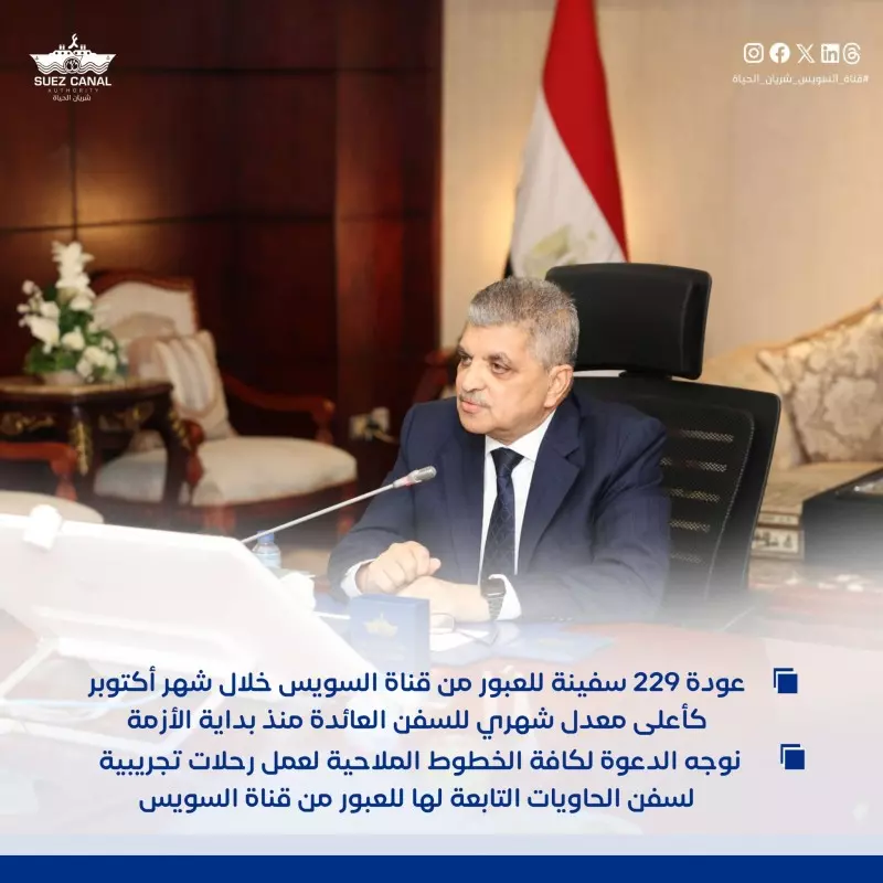 وأشار رئيس الهيئة إلى أن قمة شرم الشيخ للسلام انعكست إيجابا على هدوء الأوضاع في المنطقة وعودة العديد من السفن للعبور مجدداً من القناة، حيث سجلت إحصائيات الملاحة بالقناة خلال شهر أكتوبر الماضي عودة 229 سفينة كأعلى معدل شهري للسفن العائدة منذ بداية الأزمة.