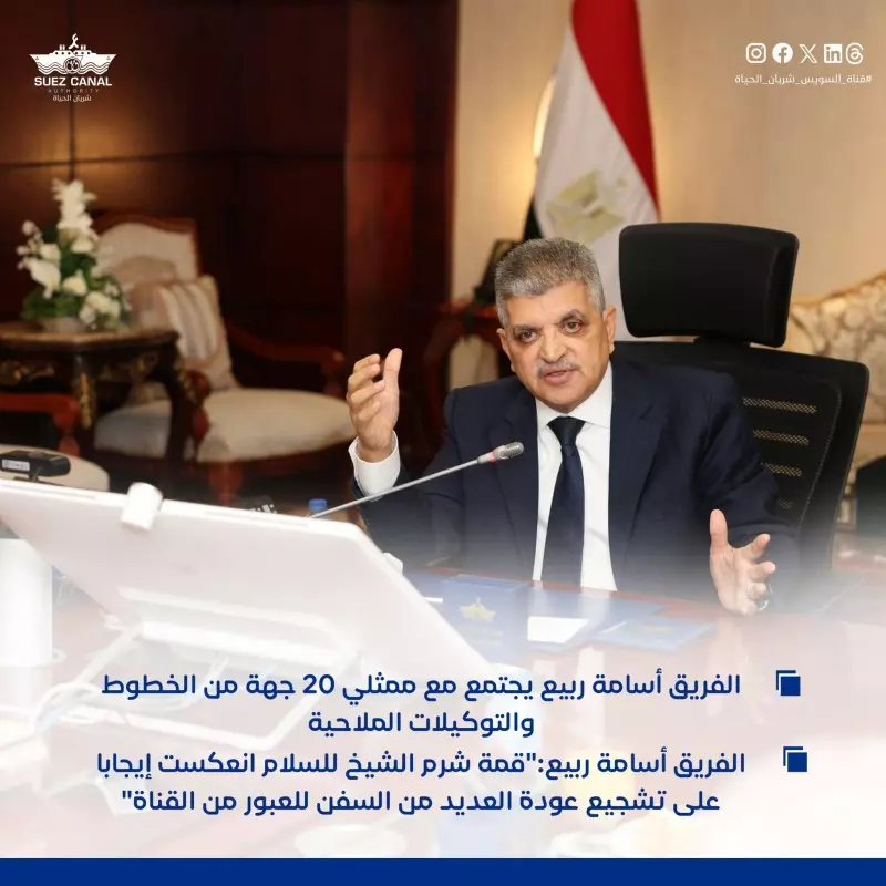 اجتمع الفريق أسامة ربيع رئيس هيئة قناة السويس، مع ممثلي 20 جهة من الخطوط والتوكيلات الملاحية، لبحث تطورات الأوضاع في منطقة البحر الأحمر وباب المندب ومدى تأثيرها على حركة التجارة العالمية العابرة للقناة وسوق النقل البحري، بحضور الفريق أشرف عطوة نائب رئيس الهيئة، وعدد من أعضاء مجلس إدارة الهيئة، وذلك بمقر الهيئة بمبنى الإرشاد بمحافظة الإسماعيلية.
