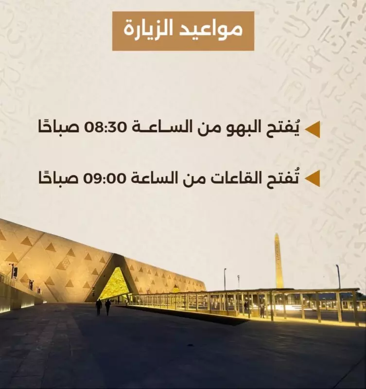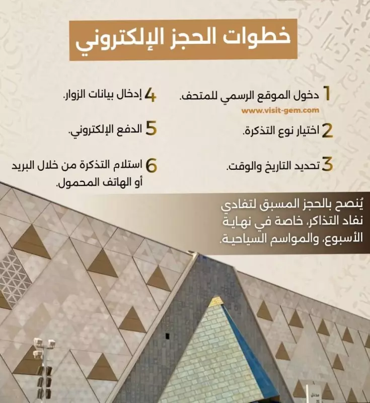 في إطار دورها الداعم للحركة السياحية والترويج للآثار المصرية، أعلنت بوابة المحروسة نيوز عن نشر دليل مبسّط للزائر إلى المتحف المصري الكبير، يوضح خطوات الزيارة بداية من حجز التذاكر وحتى جولاته الداخلية، وذلك لمساعدة الزوار من المصريين والسائحين على الاستمتاع بتجربة ثقافية استثنائية في واحد من أهم وأكبر المتاحف العالمية.