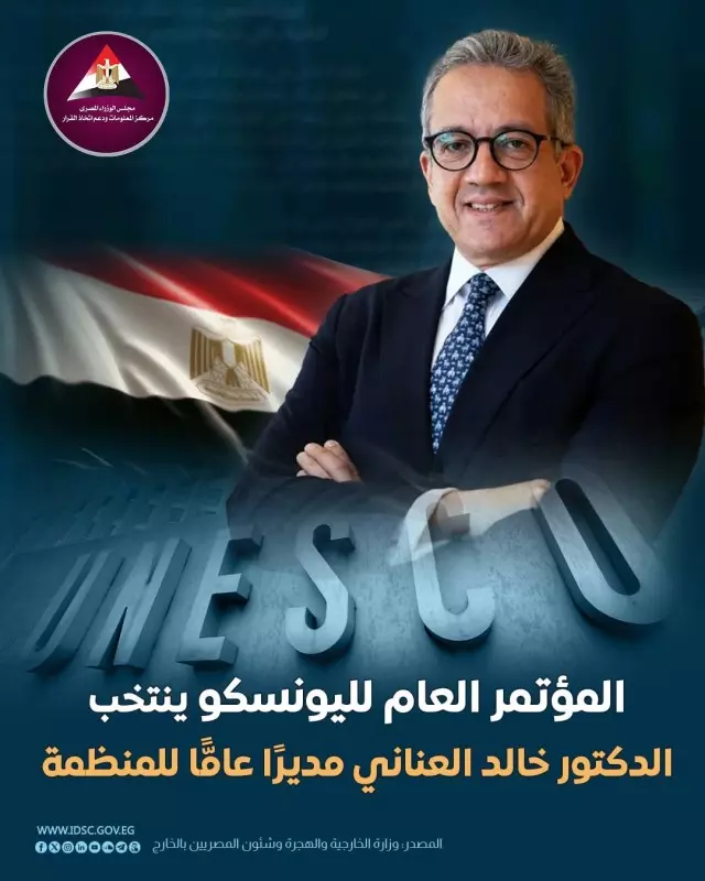 اعتمد المؤتمر العام لمنظمة الأمم المتحدة للتربية والعلم والثقافة (اليونسكو) انتخاب الدكتور خالد العناني مديرا عاما جديدا لليونسكو، وذلك خلال الانتخابات التي عُقدت يوم الخميس ٦ نوفمبر ٢٠٢٥ بمدينة سمرقند في أوزبكستان.