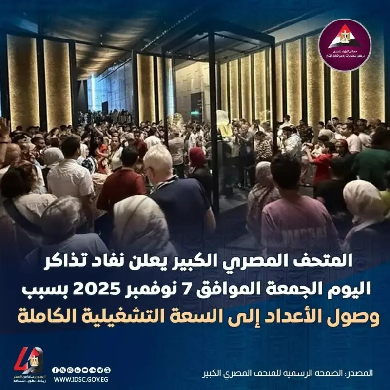 شهد المتحف المصري الكبير اليوم الجمعة الموافق 7 نوفمبر 2025 إقبالاً كثيفاً من الزائرين، مما أدى إلى نفاد جميع تذاكر الدخول ووصول أعداد الزوار داخل المتحف إلى السعة التشغيلية الكاملة المقررة لليوم.
