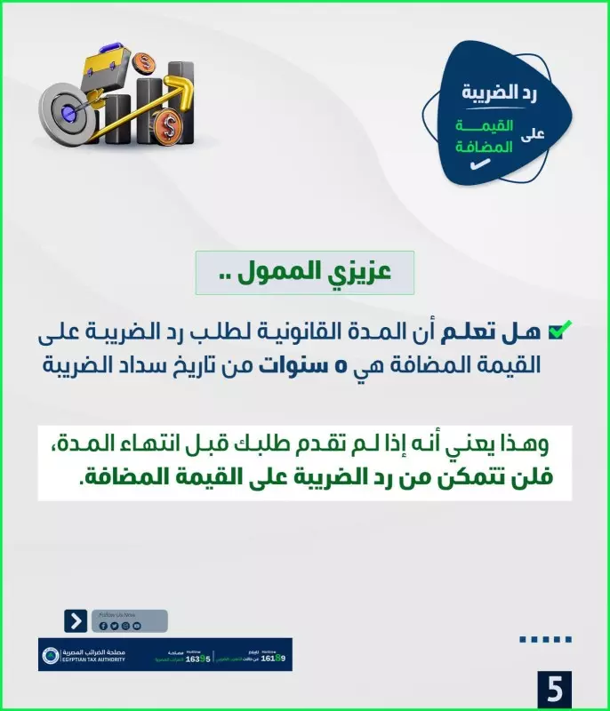 وأشار إلى أهمية أن تتضمن طلبات رد الضريبة نموذج الشهادة الموقّعة من محاسب مقيد بجدول المحاسبين والمراجعين، والتي تُثبت أحقية الممول في استرداد الضريبة، بالإضافة إلى إقرار بالمسؤولية القانونية، وذلك حفاظًا على عدم رفض الطلب وضمان استيفائه لكافة الشروط القانونية.