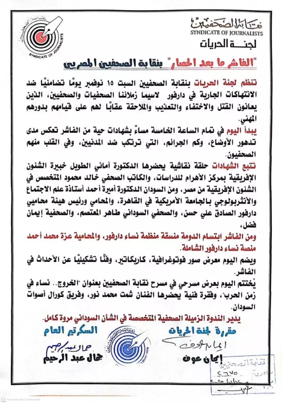 تنظم لجنة الحريات بنقابة الصحفيين السبت 15 نوفمبر يومًا تضامنيًا ضد الانتهاكات الجارية في دارفور لاسيما زملائنا الصحفيات والصحفيين، الذين يعانون القتل والاختفاء والتعذيب والملاحقة عقابًا لهم على قيامهم بدورهم المهني.