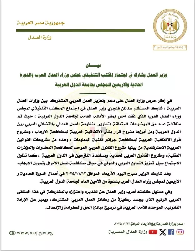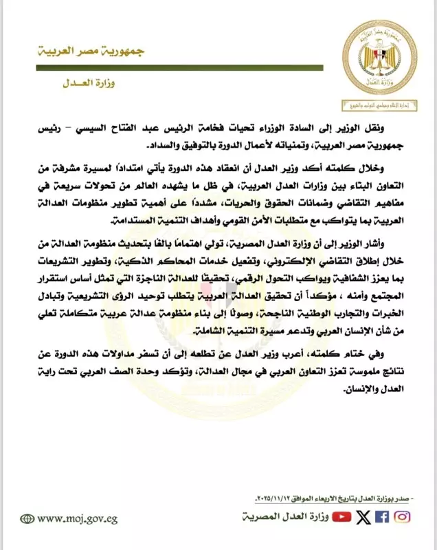 وأشار الوزير إلى أن وزارة العدل المصرية، تولي اهتمامًا بالغًا بتحديث منظومة العدالة من خلال إطلاق التقاضي الإلكتروني، وتفعيل خدمات المحاكم الذكية، وتطوير التشريعات بما يعزز الشفافية ويواكب التحول الرقمي، تحقيقًا للعدالة الناجزة التي تمثل أساس استقرار المجتمع وأمنه ، مؤكداً أن تحقيق العدالة العربية يتطلب توحيد الرؤى التشريعية وتبادل الخبرات والتجارب الوطنية الناجحة، وصولًا إلى بناء منظومة عدالة عربية متكاملة تُعلي من شأن الإنسان العربي وتدعم مسيرة التنمية الشاملة.