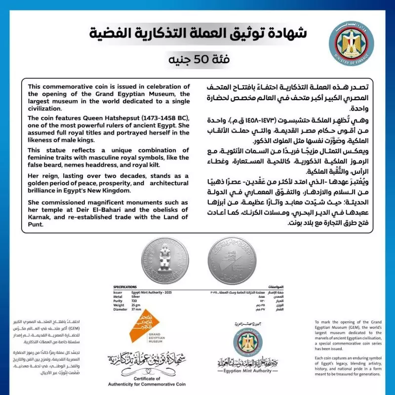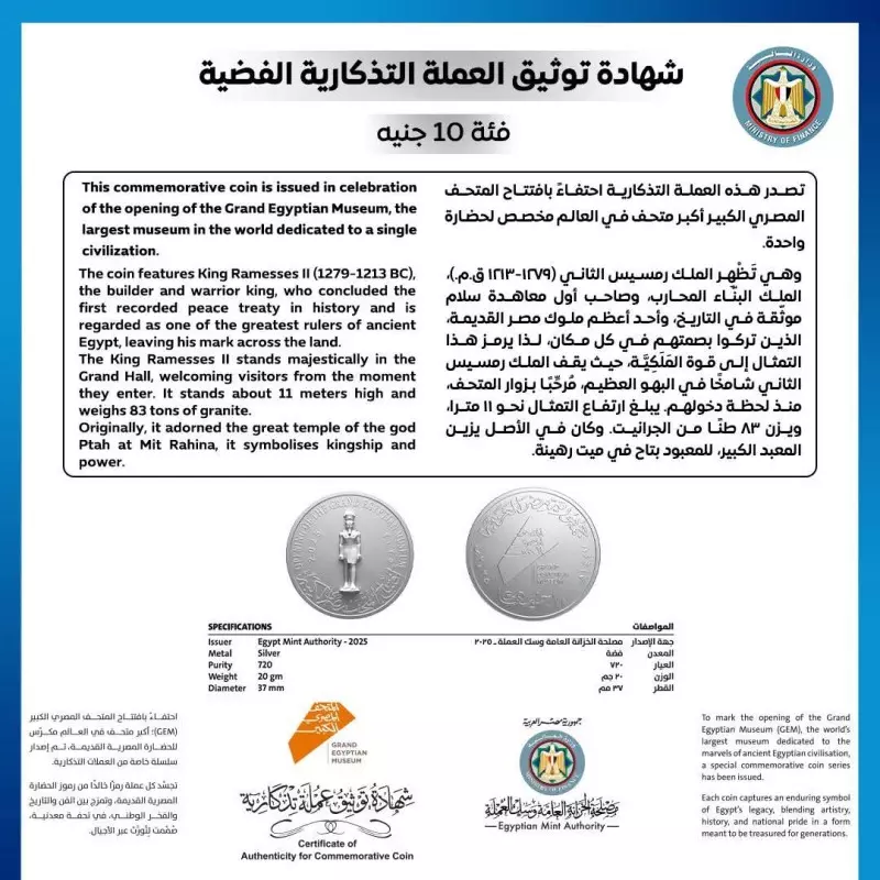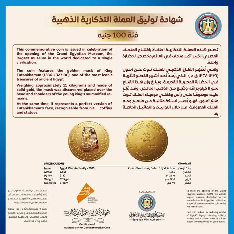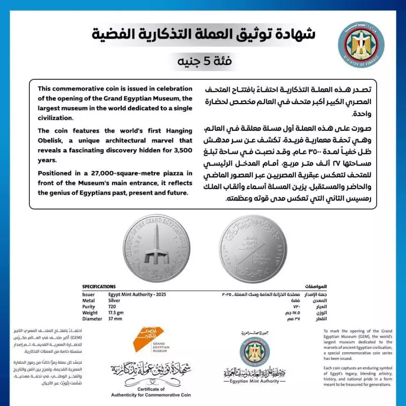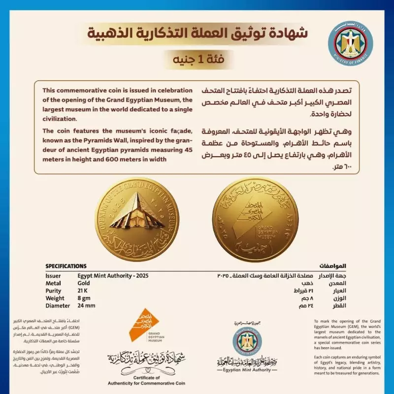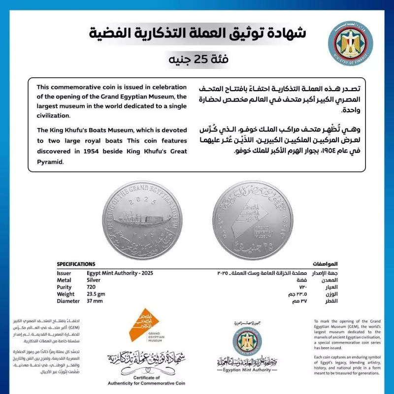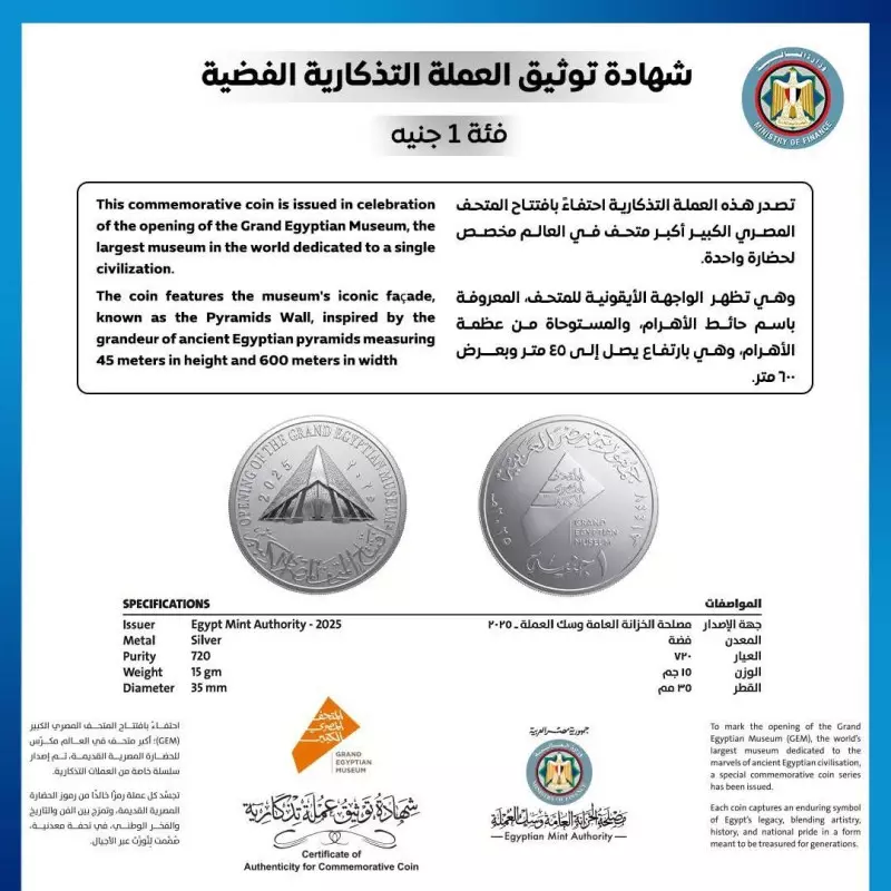 قال جمال حسين رئيس مصلحة الخزانة العامة وسك العملة، إن هناك أنماطًا متنوعة ومتميزة من العملات التذكارية الذهبية والفضية التى توثق أهم معالم المتحف المصرى الكبير، بما يلبي جميع رغبات المواطنين والسياح.