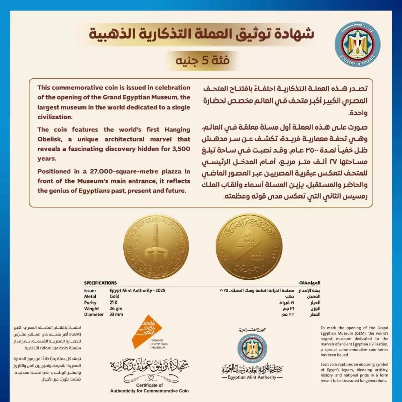 عملة المتحف المصري فئة 5 جنيه ذهب