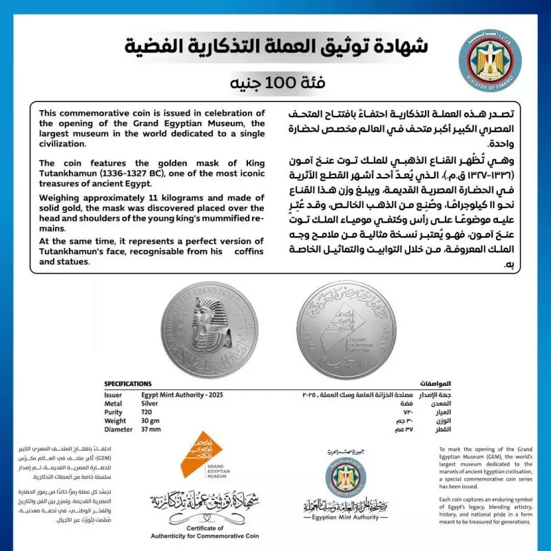 عملة المتحف المصري فئة 100 جنيه ذهب وفضة