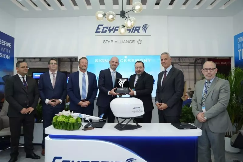 حيث شهد الطيار أحمد عادل رئيس مجلس الإدارة والعضو المنتدب التنفيذي للشركة القابضة لمصر للطيران توقيع الاتفاقية خلال فعاليات معرض دبي للطيران 2025 والتي وقعت بين الطيار وليد سليمان رئيس أكاديمية مصر للطيران للتدريب ، والسيد Matt Laue, نائب رئيس المبيعات