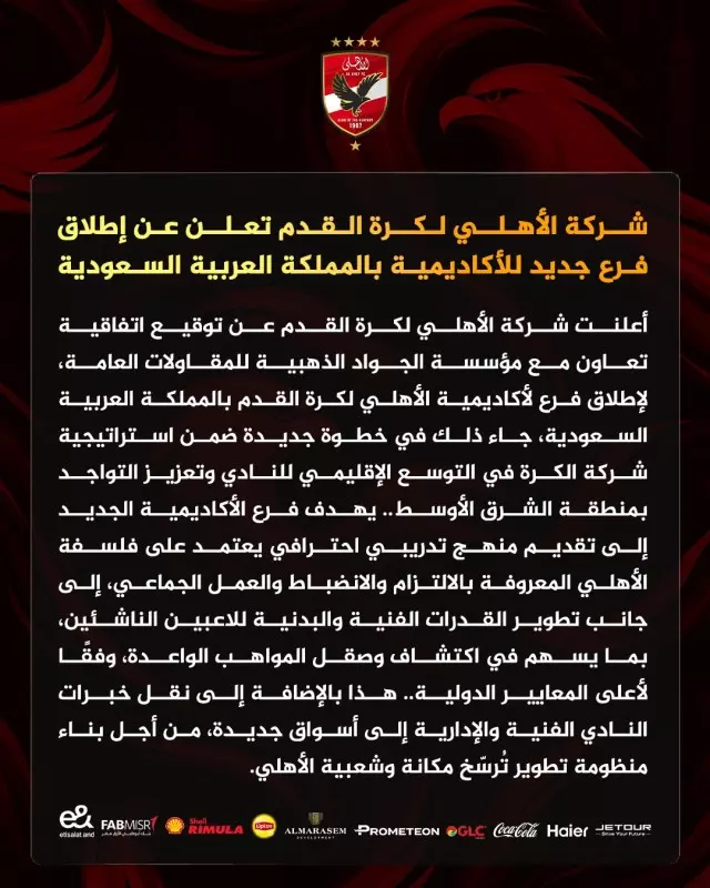 يهدف فرع الأكاديمية الجديد إلى تقديم منهج تدريبي احترافي يعتمد على فلسفة الأهلي المعروفة بالالتزام والانضباط والعمل الجماعي، إلى جانب تطوير القدرات الفنية والبدنية للاعبين الناشئين، بما يسهم في اكتشاف وصقل المواهب الواعدة، وفقًا لأعلى المعايير الدولية..