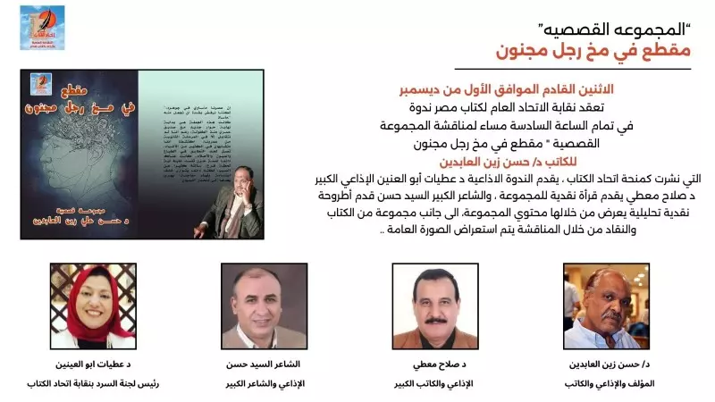تنظم النقابة العامة لاتحاد الكتّاب، مساء الاثنين المقبل الموافق الأول من ديسمبر، ندوة أدبية لمناقشة المجموعة القصصية الجديدة «مقطع في مخ رجل مجنون» للكاتب والإذاعي الكبير الدكتور حسن زين العابدين، وذلك في تمام الساعة السادسة مساءً بمقر الاتحاد 11 أشارع حسن صبرى الزمالك أمام السفارة الهولندية .