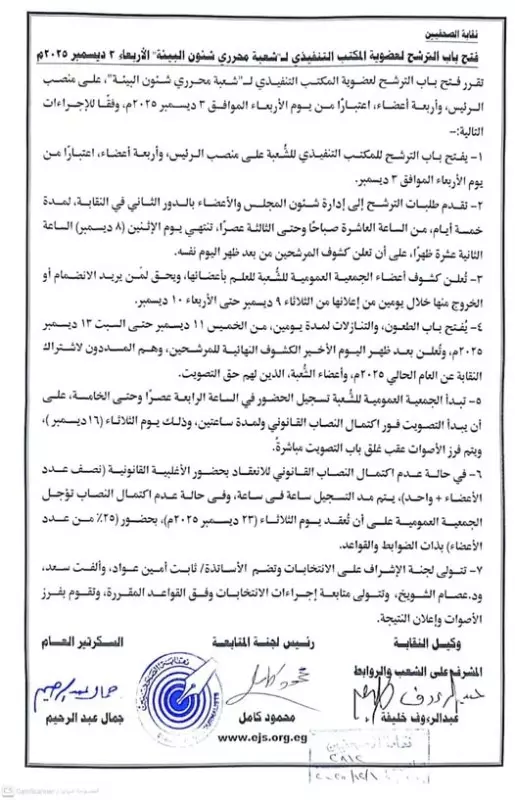 4– يُفتح باب الطعون، والتنازلات لمدة يومين، من الخميس 11 ديسمبر حتى السبت 13 ديسمبر 2025م، وتُعلن بعد ظهر اليوم الأخير الكشوف النهائية للمرشحين، وهم المسددون لاشتراك النقابة عن العام الحالي 2025م، وأعضاء الشُّعبة، الذين لهم حق التصويت.