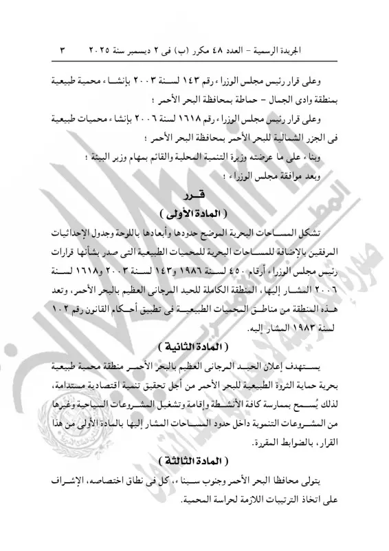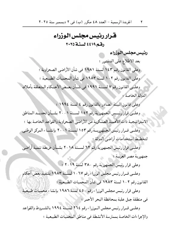 نشرت الجريدة الرسمية، قرار رئيس مجلس الوزراء رقم 4419 لسنة 2025، بشأن اعتبار المنطقة الكاملة للحيد المرجاني العظيم بالبحر الأحمر من مناطق المحميات الطبيعية، وذلك في العدد 48 مكرر ب في 2 ديسمبر 2025.