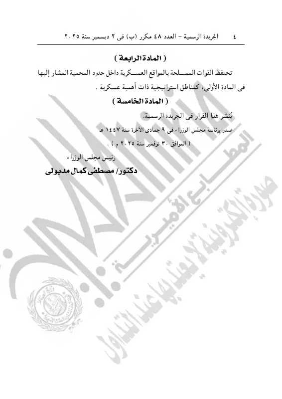 وجاء في المادة 4 من القرار، تحتفظ القوات المسلحة بالمواقع العسكرية داخل حدود المحمية المشار إليها في المادة الأولى، كمناطق استراتيجية ذات أهمية عسكرية.