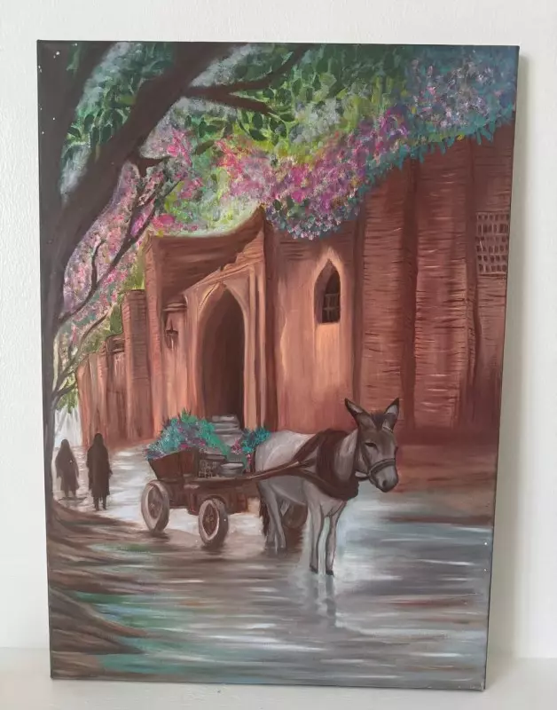 بيوت الطين، أشجار تتمايل، نساء يسعين في المشهد من بعيد، وحمار يجر عربة على طريق مبتلّ بالمطر تنعكس عليه الظلال في لمسة شاعرية مؤثرة.