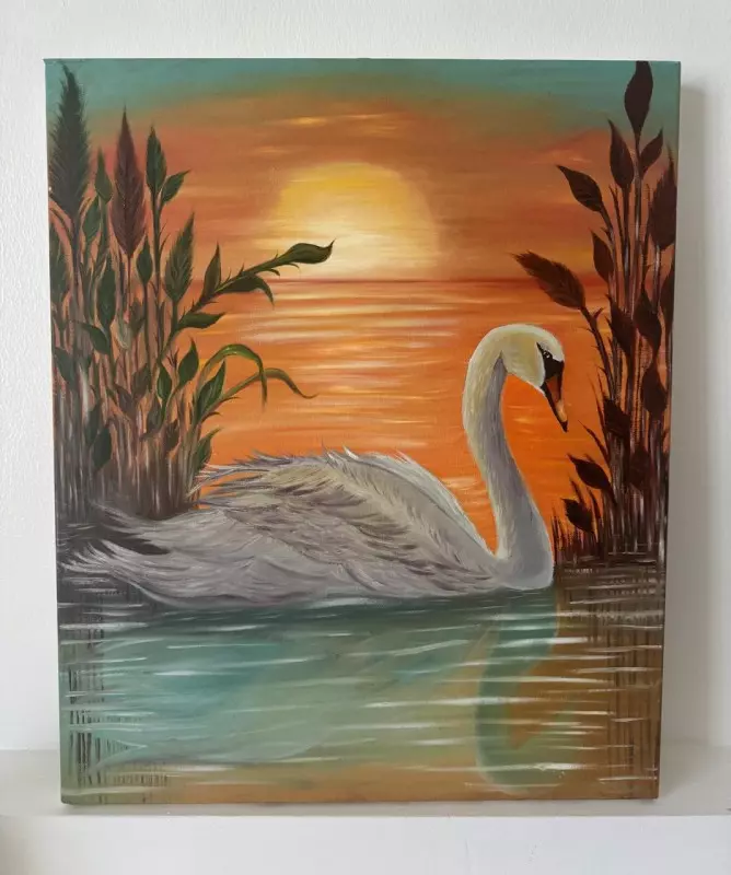 استخدمت فيه الفنانة الألوان الزيتية لإبراز التفاصيل الحية، مع خلفية من الريزن والأحجار والجلتر لخلق طبقات لامعة تمنح اللوحة عمقًا وأناقة خاصة.
