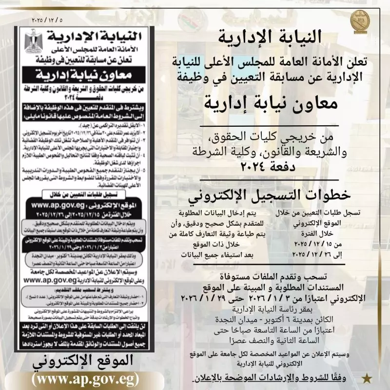 واختتمت النيابة الإدارية بيانها بالتأكيد على أن عملية الاختيار تتم وفق أعلى معايير النزاهة والشفافية، وأنه لن يُلتفت لأي طلبات تقدم خارج المواعيد المحددة أو غير مستوفاة للشروط.