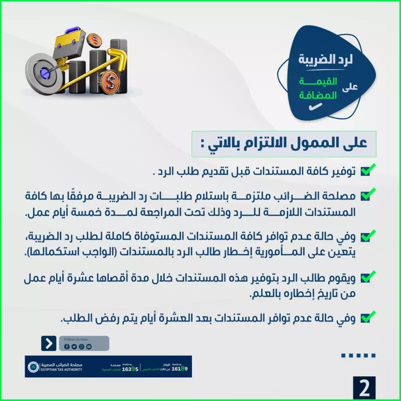 ودعا محمود سليمان الممولين إلى الاطلاع المسبق على المستندات الداعمة لرد الضريبة، وكذلك الأسئلة والأجوبة الخاصة بإجراءات رد ضريبة القيمة المضافة، من خلال الموقع الرسمي لمصلحة الضرائب المصرية، بما يسهم في تقليل الأخطاء وتسريع إجراءات الرد، وذلك عبر الرابط التالي: