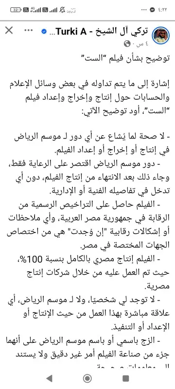 وأضاف أن فيلم «الست» إنتاج مصري خالص بنسبة 100%، تم تنفيذه من خلال شركات إنتاج مصرية، كما أن المخرج والكاتب وأبطال العمل والشركة المنتجة جميعهم مصريون، ولا توجد له شخصيًا أو لموسم الرياض أي علاقة مباشرة بالعمل من حيث الإعداد أو التنفيذ.