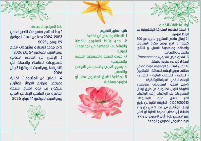 وقد بدأت اللجنة التنفيذية للمسابقة في استلام مشروعات التخرج من راغبي المشاركة في 29 نوفمبر الماضي٬ علي أن يكون السبت الموافق 24 يناير 2026 آخر موعد للاستلام٬ تمهيداً للإعلان عن المشروعات المتأهلة والجهات التي تنتمي إليها يوم السبت الموافق 31 يناير 2026.