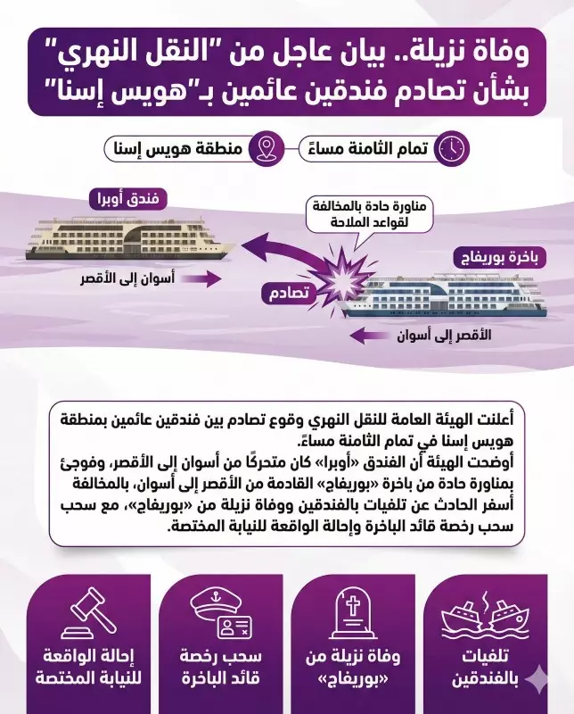 وأوضحت الهيئة أن الحادث وقع أثناء تحرك الفندق العائم «أوبرا» من أسوان إلى الأقصر، حيث وبعد عبوره هويس إسنا بنحو كيلومترين، فوجئ بقيام قائد الباخرة العائمة «بوريفاج»، المتحركة من الأقصر في اتجاه أسوان، بتنفيذ مناورة حادة مفاجئة أمامه.