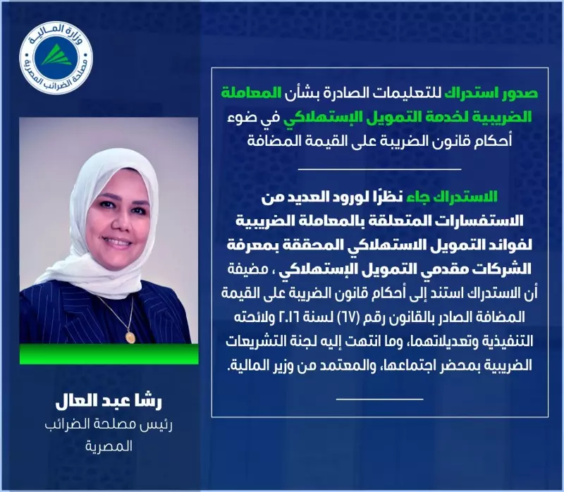 أعلنت رشا عبد العال رئيس مصلحة الضرائب المصرية، إصدار المصلحة استدراكًا للتعليمات رقم (25) لسنة 2022، بشأن المعاملة الضريبية لخدمة التمويل الإستهلاكي في ضوء أحكام قانون الضريبة على القيمة المضافة ، وإنه يأتى في إطار توجيهات وزير المالية أحمد كجوك بضرورة تبسيط الإجراءات الضريبية، وتوضيح أسس المحاسبة الضريبية، وحسم أية تفسيرات قد تؤدي إلى اختلاف في التطبيق، أصدرت المصلحة استدراكًا للتعليمات رقم (25) لسنة 2022، بشأن المعاملة الضريبية لخدمة التمويل الإستهلاكي في ضوء أحكام قانون الضريبة على القيمة المضافة.
