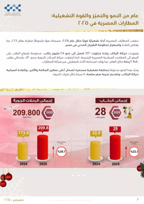 ووفقًا للبيانات التشغيلية المعتمدة، سجلت المطارات المصرية التابعة للشركة المصرية للمطارات أداءً تشغيليًا قويًا خلال عام 2025، حيث بلغ إجمالى عدد الركاب خلال مرحلتى السفر والوصول نحو 28 مليون راكب، مقابل 22.9 مليون راكب خلال عام 2024، بنسبة نمو بلغت 22.3%، فى مؤشر واضح على تعافى حركة النقل الجوى وارتفاع الطلب على السفر.