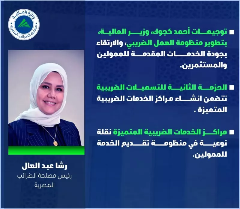 أكدت رشا عبد العال، رئيس مصلحة الضرائب المصرية، أن مراكز الخدمات الضريبية المتميزة والتي تأتي ضمن الحزمة الثانية للتسهيلات الضريبية، تمثل تحولًا جوهريًا في فلسفة تقديم الخدمة الحكومية، وذلك تنفيذًا لتوجيهات أحمد كجوك، وزير المالية، بتطوير منظومة العمل الضريبي، والارتقاء بجودة الخدمات المقدمة للممولين والمستثمرين، بما يحقق السرعة والكفاءة ويضع المواطن في قلب منظومة الخدمة.