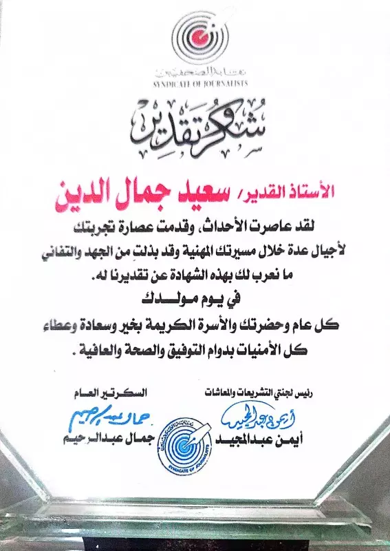 وأكدت النقابة، في نص الشهادة التي أُهديت للأستاذ سعيد جمال الدين سرحان مع درع النقابة، أنه: