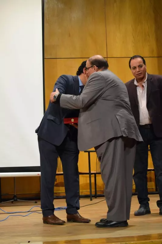 وقام بتسليم درع النقابة كل من الأستاذ جمال عبد الرحيم، السكرتير العام لنقابة الصحفيين، والأستاذ أيمن عبد المجيد، عضو مجلس النقابة ورئيس لجنتي التشريعات والرواد، وسط حضور نقابي وصحفي لافت.