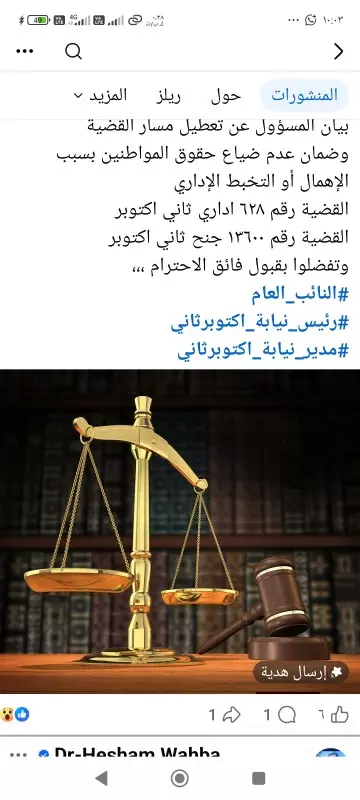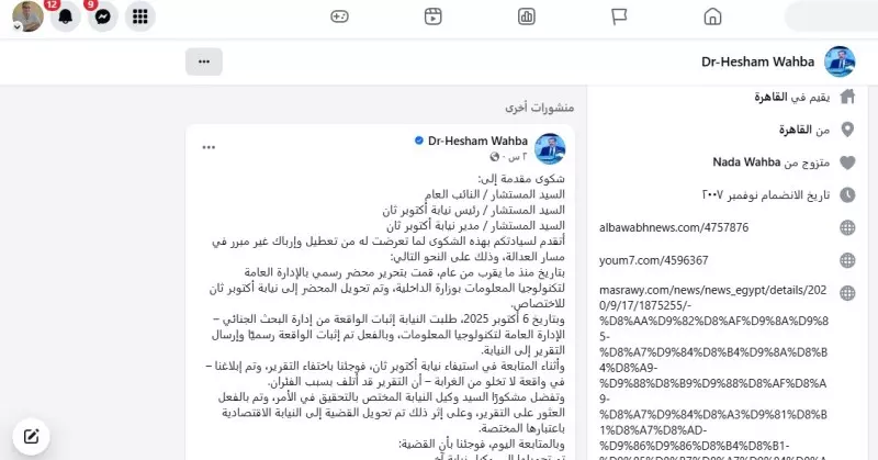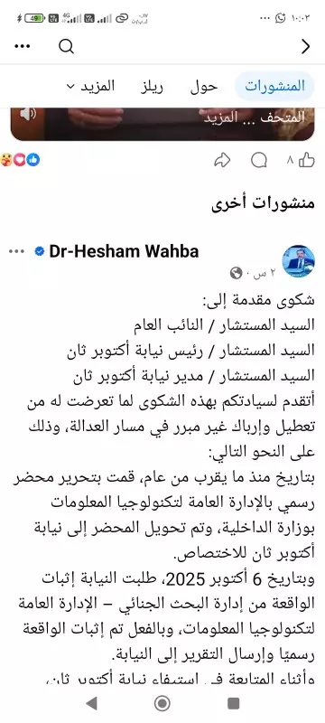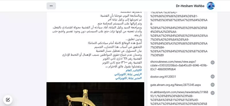 تقدم هشام وهبة، عضو مجلس إدارة غرفة المنشآت والمطاعم السياحية السابق، ورئيس لجنة السياحة والآثار بحزب مستقبل وطن بمحافظة الجيزة، ببلاغ رسمي إلى معالى المستشار محمد شوقي، النائب العام، كشف فيه عن وقائع وصفها بـ«الخطيرة» تتعلق بتعطيل وإرباك غير مبرر في مسار العدالة داخل نيابة أكتوبر ثان.