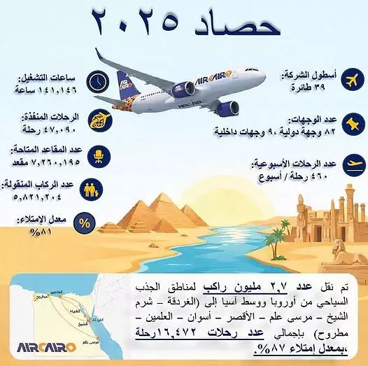 في إطار دورها الوطني في دعم منظومة النقل الجوي وتعزيز الحركة السياحية، واصلت شركة إير كايرو تحقيق أداء تشغيلي مرتفع خلال عام 2025، مؤكدة مكانتها كأحد الركائز الأساسية لشبكة الطيران المصرية والإقليمية.
