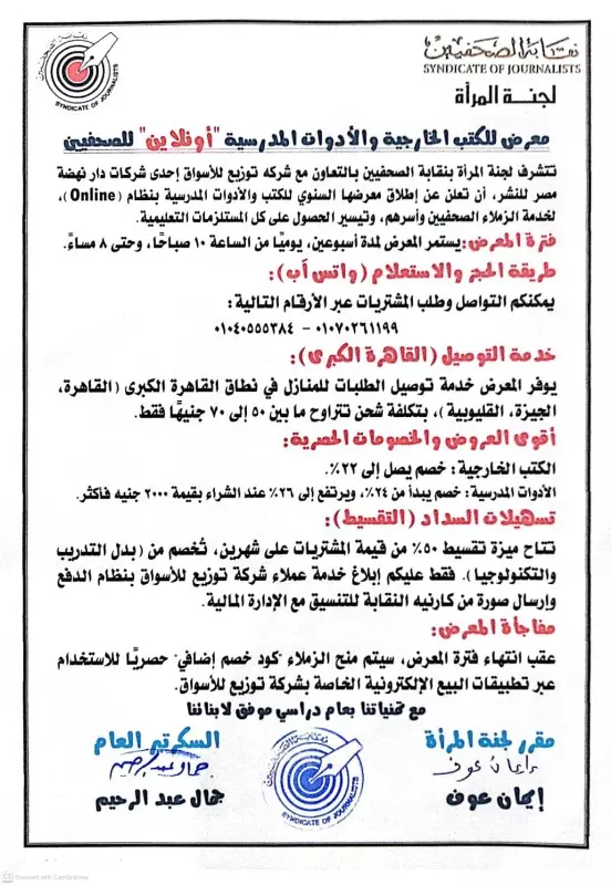 تتشرف لجنة المرأة بنقابة الصحفيين بالتعاون مع شركه توزيع للأسواق إحدى شركات دار نهضة مصر للنشر، أن تعلن عن إطلاق معرضها السنوي للكتب والأدوات المدرسية بنظام (Online)، لخدمة الزملاء الصحفيين وأسرهم، وتيسير الحصول على كل المستلزمات التعليمية.