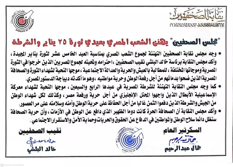 كما وجه مجلس النقابة التهنئة لجموع الشعب المصري بمناسبة العيد الخامس عشر لثورة يناير المجيدة، وأكد مجلس النقابة برئاسة خالد البلشي نقيب الصحفيين، احترامه وتحيته لجموع المصريين الذين خرجوا في الثورة المصرية وموجاتها المختلفة، للمطالبة بالعيش والحرية والعدالة الاجتماعية، موجها التحية لشهداء الثورة والصحافة المصرية الذين ضحوا بدمائهم من أجل رفعة الوطن وحرية مواطنيه، وهو ما أكدته ديباجة الدستور المصري.