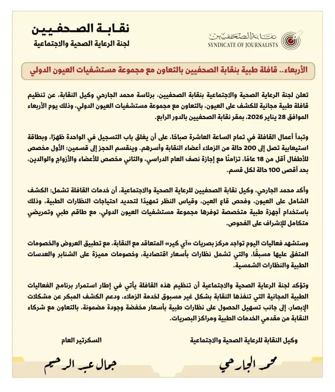 تعلن لجنة الرعاية الصحية والاجتماعية بنقابة الصحفيين، برئاسة محمد الجارحي وكيل النقابة، عن تنظيم قافلة طبية مجانية للكشف على العيون، بالتعاون مع مجموعة مستشفيات العيون الدولي، وذلك يوم الأربعاء الموافق 28 يناير 2026، بمقر نقابة الصحفيين بالدور الرابع.