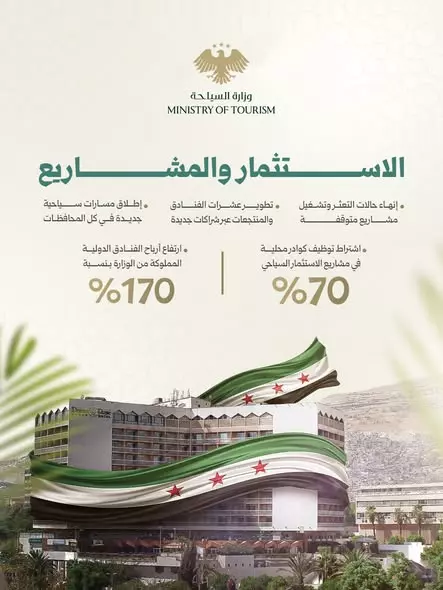 تقود وزارة السياحة جهود تطوير القطاع السياحي عبر سياسات تعزز النمو المستدام وترفع تنافسية المقصد السوري، مع توسيع الفرص الاستثمارية في قطاعات الضيافة والسياحة الثقافية. وتعمل الوزارة على تمكين الشراكة مع القطاع الخاص، وتحسين جودة الخدمات، وترسيخ مكانة سوريا كوجهة واعدة في المنطقة.