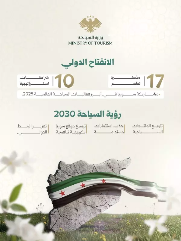 وبدأت وزارة السياحة العمل على تحقيق تلك الأهداف خلال العام الأول من التحرير 2025، والذي شهد افتتاح عدد من المشاريع السياحية، وإبرام عقود ومذكرات تفاهم، وإنهاء حالات التعثر لعدد من المشاريع السياحية، والعمل على تعزيز القدوم السياحي إلى سورية من خلال تنويع الأنماط السياحية الثقافية، العلاجية، التعليمية، التاريخية، وغيرها من أنواع السياحة، لاستهداف أسواق جديدة،