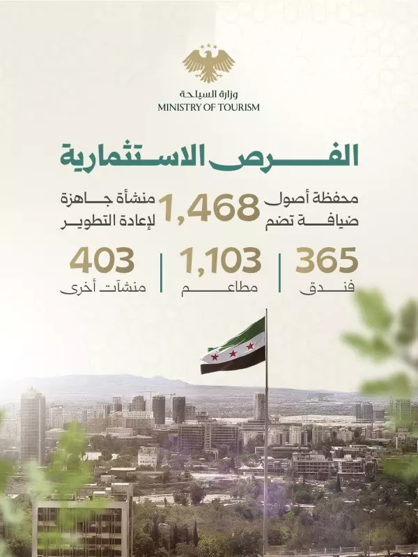 تشير البيانات الحديثة إلى وجود 1,468 منشأة سياحية في مختلف المحافظات السورية تحتاج إلى إعادة تشغيل أو تطوير، موزعة على 365 فندقاً، و1,103 مطاعم، و403 منشآت سياحية متنوعة. ويعكس هذا العدد الكبير من المنشآت فرصًا استثمارية واعدة أمام المستثمرين المحليين والعرب والأجانب، سواء عبر إعادة تأهيل الأصول القائمة، أو تطوير مشاريع ضيافة وترفيه جديدة ضمن مواقع تتمتع بمقومات سياحية وثقافية وغنية بالطلب المتزايد على القطاع. وتُعد هذه المؤشرات قاعدة مهمة لمرحلة توسّع استثماري تتوافق مع نمو الحركة السياحية وارتفاع أعداد الزوار خلال عام 2025.