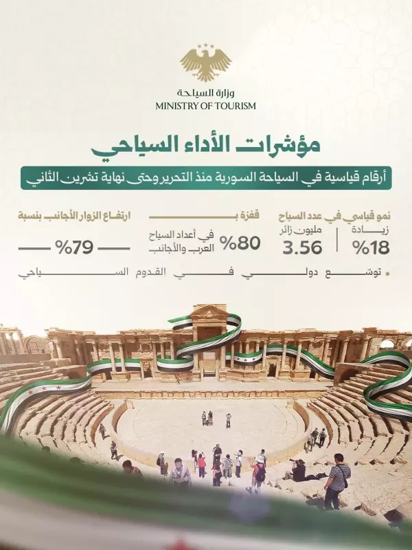 أكد مازن الصالحاني ، وزير السياحة السورى ، ارتفاع أعداد السياح العرب والأجانب القادمين إلى سوريا منذ التحرير وحتى نهاية تشرين الثاني 2025 بنسبة 80%، مقارنة بالفترة نفسها من 2024، ما يعكس عودة النشاط السياحي الحقيقي بعد التحرير، فيما ارتفع مجمل الزوار والسياح من سوريين وعرب وأجانب بنسبة 18% في 2025 مقارنة مع العام 2024 ليبلغ 3,56 مليونا ارتفاعا من 3,011 مليونا.
