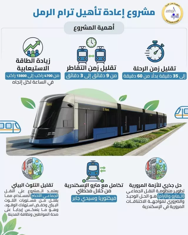 نشرت وزارة النقل، مجموعة من الإنفوجرافات أوضحت خلالها مواصلة تنفيذ مشروع إعادة تأهيل ترام الرمل بمحافظة الإسكندرية، ضمن الرؤية الاستراتيجية للدولة لتطوير منظومة النقل الجماعي “الأخضر المستدامة”، بما يضمن تقديم خدمات تليق بالمواطنين ويسهم بفعالية في إنهاء أزمات الاختناق المروري داخل عروس البحر المتوسط