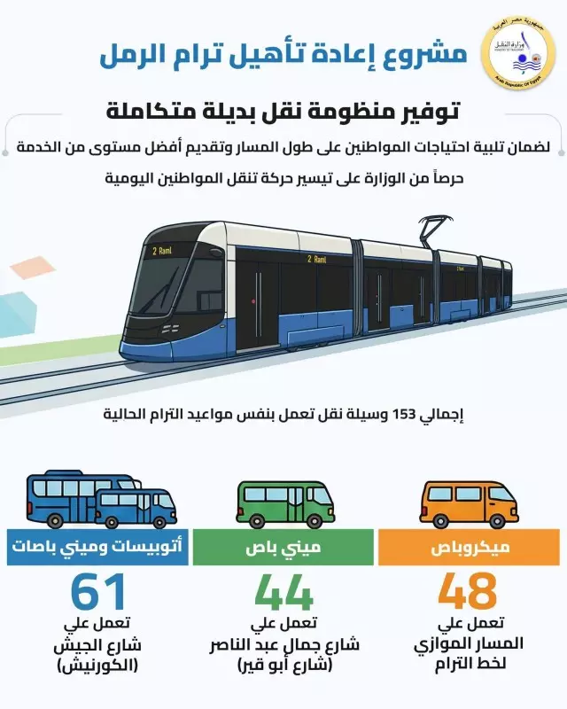 وأكد بيان وزارة النقل، أنه تزامنًا مع الإيقاف التجريبي للترام (الذي بدأ في 1 فبراير 2026)، وفرت الوزارة بالتعاون مع المحافظة 153 وسيلة نقل بديلة متكاملة لخدمة الركاب بنفس المواعيد الحالية، تشمل: (61 أتوبيسًا وميني باص على محور شارع الجيش (الكورنيش) – 44 ميني باص لخدمة شارع جمال عبد الناصر (أبو قير) – 48 ميكروباصًا تعمل على المسار الموازي لخط الترام).