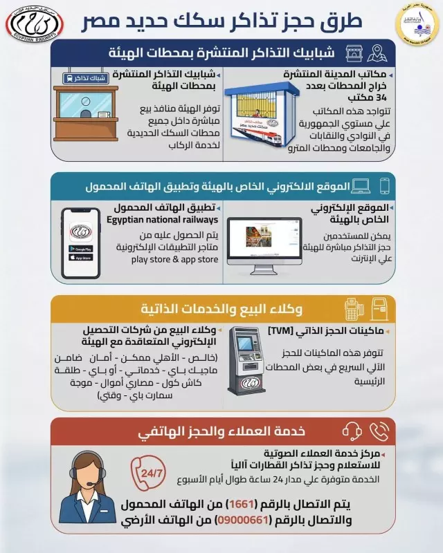 تتيح هيئة السكك الحديدية منافذ بيع مباشرة داخل جميع محطات القطار على مستوى الجمهورية، حيث يمكن للمواطنين شراء التذاكر بشكل فوري قبل موعد السفر.
