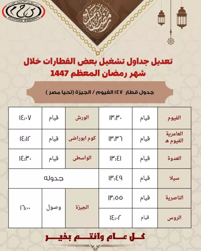 في إطار حرص الهيئة القومية لسكك حديد مصر التيسير على جمهور الركاب خلال شهر رمضان المبارك، تقرر تعديل مواعيد بعض القطارات على عدد من خطوط الشبكة بما يتماشى مع طبيعة التشغيل وخدمة جمهور الركاب خلال الشهر الكريم، وذلك اعتبارًا من يوم الاربعاء الموافق 18 فبراير 2026، ومع بدء شهر رمضان المعظم كالتالى :