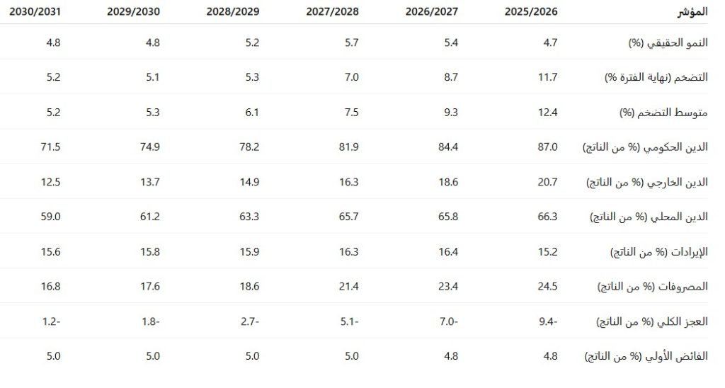 وعلى صعيد المالية العامة، تشير التقديرات إلى مسار هبوطي واضح للدين الحكومي، إذ يُتوقع أن ينخفض من 87.0% من الناتج المحلي في 2025 / 2026 إلى نحو 71.5% بحلول 2030 / 2031، مدفوعًا بتراجع كل من الدين الخارجي إلى 12.5%، والدين المحلي إلى 59.0% من الناتج.
