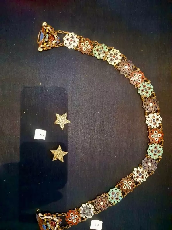 ومن جانبها، أشارت رشا سعيد، مسؤول قسم المعارض المؤقتة بالمتحف، إلى أن من بين القطع المعروضة عقدًا من أحجار الكوارتز البرتقالي، وأسورة من الفضة تجمع بين الكرات والمكعبات، وأخرى فضية تتدلى منها دلايات، إلى جانب حزام مزخرف بالخرز الملون، وأسورة مطعّمة بالمينا متعددة الألوان ال(أزرق والأخضر والأحمر) على هيئة ورود متلاصقة، ودبوس صدر من الفضة المطلي بالذهب مرصّع بفصوص من الكوارتز الأزرق، بالإضافة إلى زوج من الحُلي يُرتدى على الكتفين مصنوع من أحجار زجاجية ملونة.