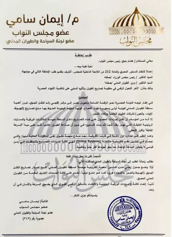 وأوضحت سامي، في بيان يعكس رؤيتها لتطوير قطاع الطيران المصري، أنها تقدمت في 31 مارس الماضي بطلب إحاطة بشأن تأخر التحول الرقمي في منظومة تصاريح الطيران، بهدف إنهاء الإجراءات الورقية الروتينية التي تستغرق وقتًا طويلًا، واستبدالها بنظام إلكتروني متكامل يحقق السرعة والكفاءة، على غرار النماذج الدولية الناجحة.