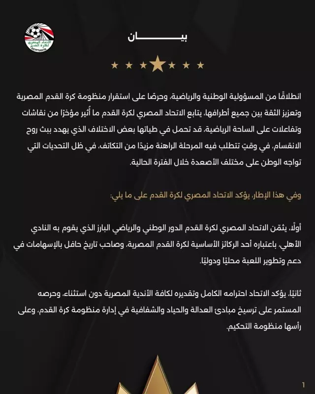 في بيان رسمي، أكد الاتحاد المصري لكرة القدم حرصه الكامل على استقرار منظومة كرة القدم في مصر، وتعزيز أواصر الثقة بين جميع أطراف اللعبة، في ظل ما شهدته الساحة الرياضية مؤخرًا من نقاشات وتفاعلات.