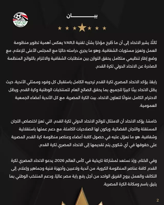 وفي ختام بيانه، دعا الاتحاد جميع مكونات الكرة المصرية—من أندية ولاعبين وأجهزة فنية وجماهير وإعلام—إلى التكاتف والعمل بروح الفريق الواحد، دعمًا للمنتخب الوطني، مع الاستعداد للمشاركة في كأس العالم 2026 بما يليق باسم ومكانة الكرة المصرية.